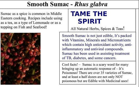 The Red Sumac Berries can be used for culinary purposes as well as Spiritual uses among alternative Spiritual and religious practices. Culinary uses include Sumac Tea, Sumac-aide, Raw Sumac Spice, and various types of Seasoning.